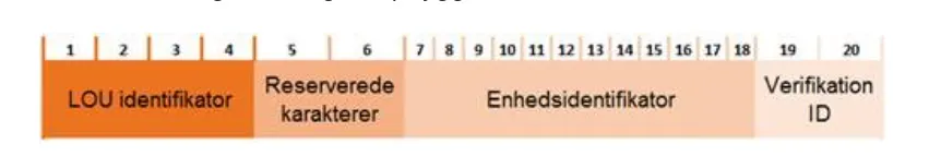 En LEI-kode er en standardiseret kode på 20 tegn, som består af både cifre og bogstaver. Koden er opbygget som her: