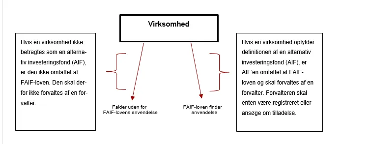 For at finde ud af hvornår en virksomhed bliver omfattet af lov om forvaltere af alternative investeringsfonde m.v. (herefter benævnt FAIF-loven), skal virksomheden vurdere, hvorvidt den opfylder betingelserne for at være en alternativ investeringsfond (herefter benævnt AIF), jf. § 3, stk. 1, nr. 1, i FAIF-loven. Såfremt fonden er en AIF, skal den enten være en selvforvaltende eller være forvaltet af en forvalter, som enten har tilladelse eller er registreret hos tilsynet, jf. §§ 6, 8 og 9 i FAIF-loven.