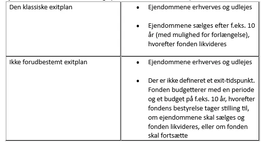 Ejendomsfonde med en klassisk exitplan er efter Finanstilsynets vurdering en fond med en investeringsstrategi, der fokuserer på investering i aktivet (ejendommen og dens værdi). Det må formodes, at hovedformålet med erhvervelsen af ejendommene er køb med henblik på at opnå fortjeneste ved salg, når der f.eks. er økonomisk opsving på boligmarkedet. Udlejning af ejendommene, indtil de sælges, anses for at være den sekundære strategi. Hvis ejendomsfonden samtidig delegerer de administrative og driftsrelaterede opgaver til et ejendomsadministrationsselskab, indikerer det yderligere, at fonden ikke har det primære fokus på drift af ejendomme, hvorfor fonden kan blive omfattet af AIF-begrebet, hvis betingelserne nævnt i § 3, stk. 1, i FAIF-loven og i bekendtgørelse om alternative investeringsfonde i øvrigt er opfyldt.