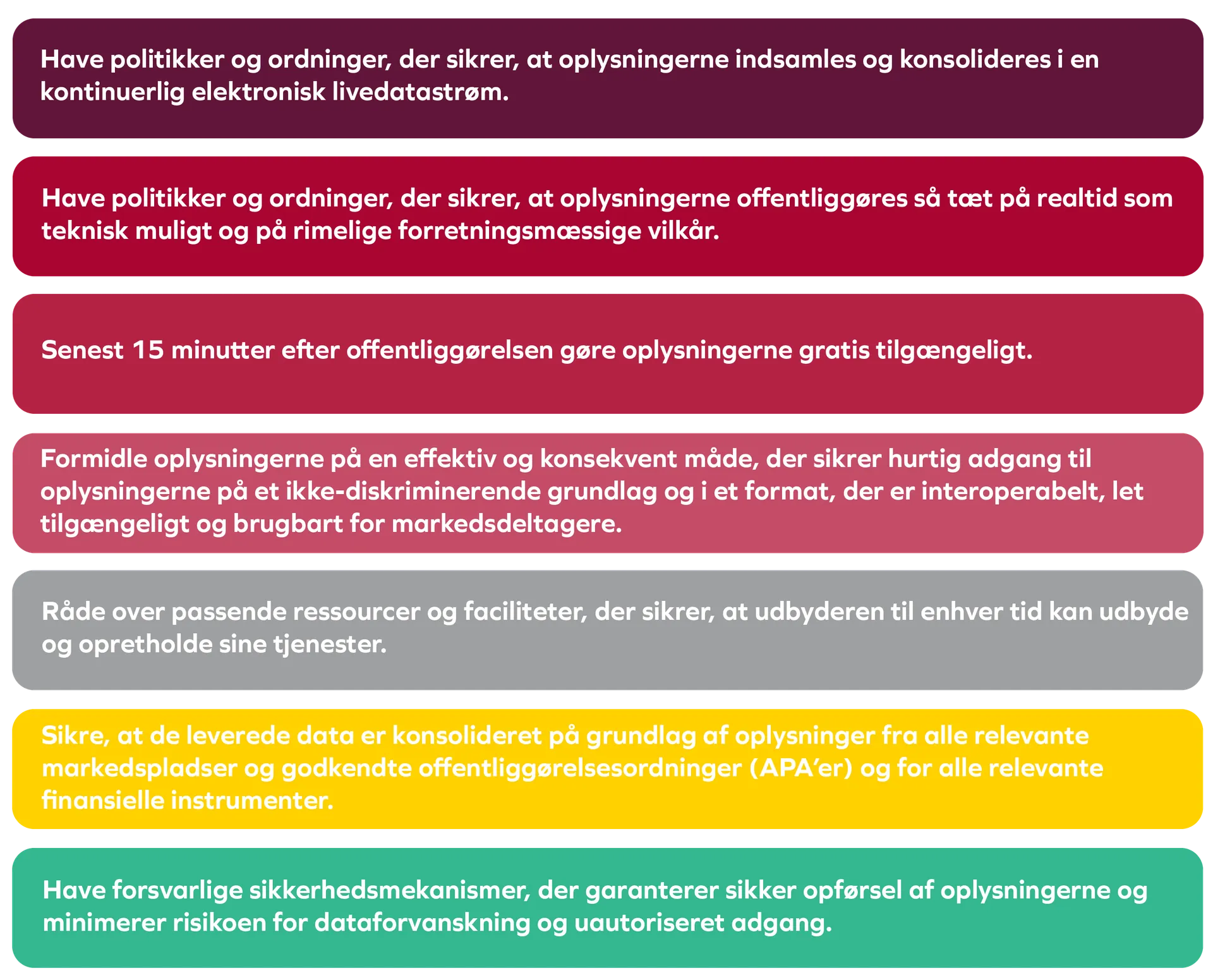 En virksomhed kan opnå tilladelse som godkendt udbyder af konsolideret løbende handelsinformation (CTP), når den opfylder en række individuelle krav, som er nærmere angivet herunder. Virksomhedens ledelse skal desuden leve op til de ledelsesmæssige krav, der gælder for udbydere af dataindberetningstjenester.