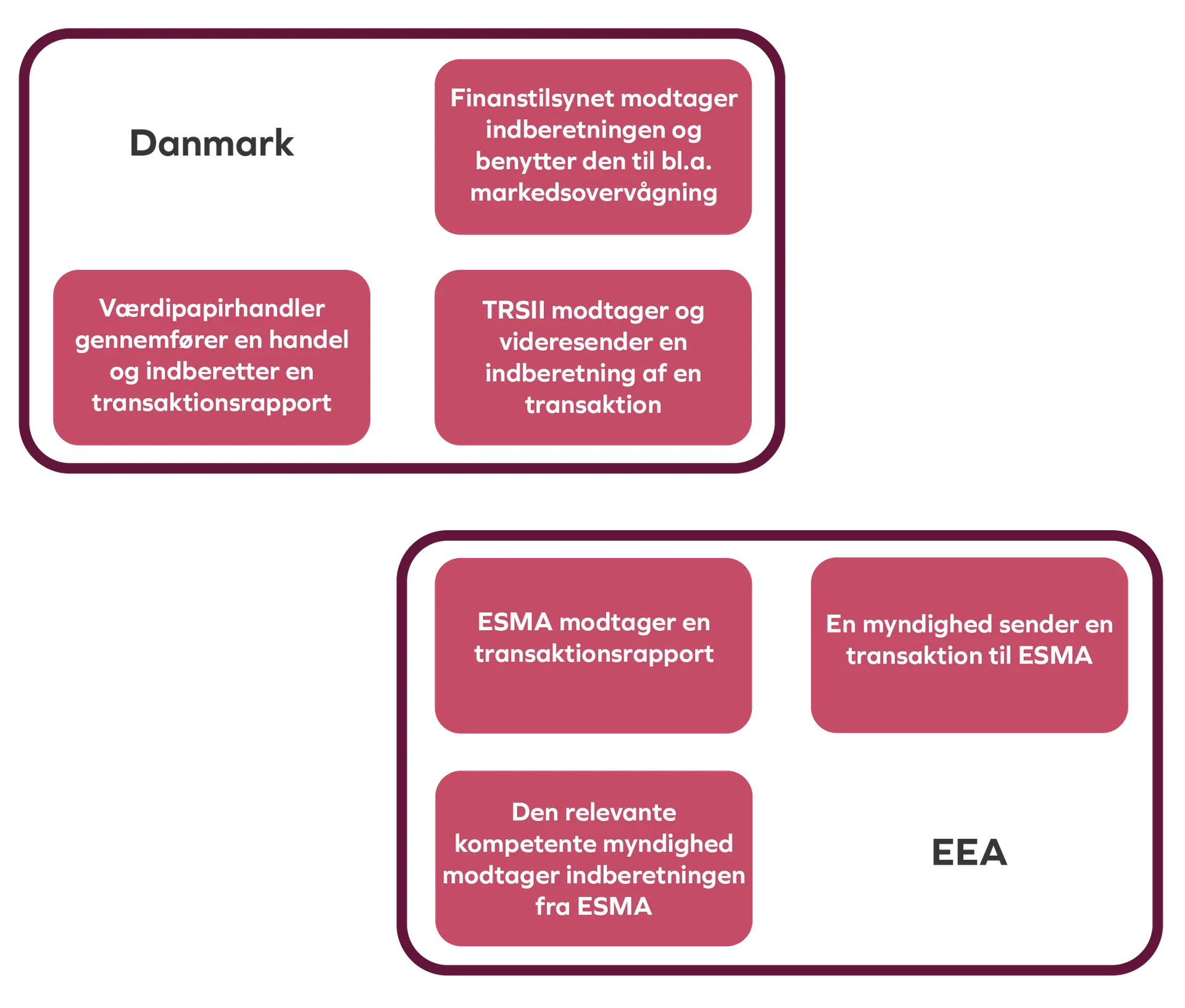 Rapporter for transaktioner gennemført på markedspladser udenfor Finanstilsynets myndighed bliver videresendt til den relevante kompetente myndighed via ESMA’s IT-service. På samme måde modtager Finanstilsynet tilsvarende rapporter om transaktioner i danske værdipapirer gennemført med udenlandske værdipapirhandlere.