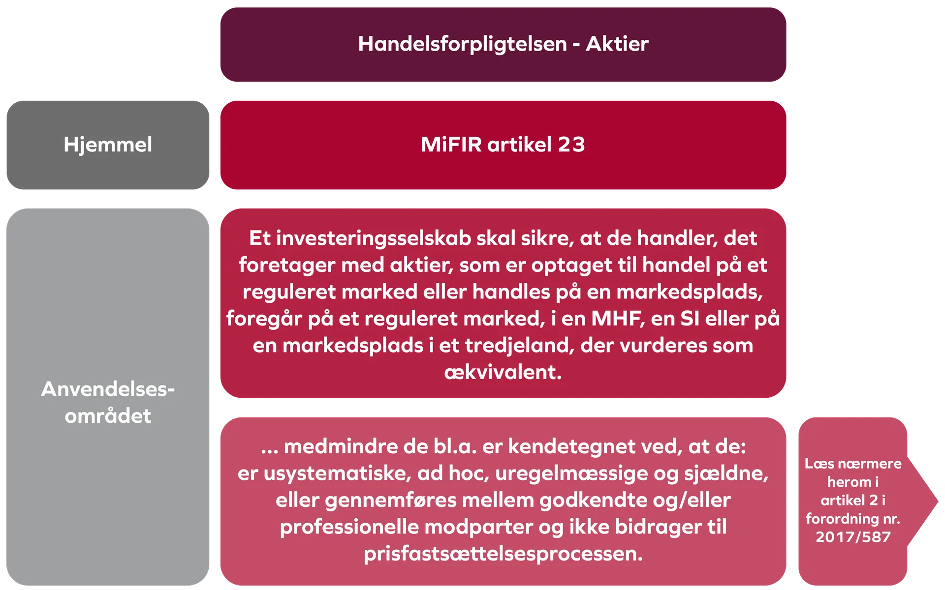 Denne handelsforpligtelse kræver, at investeringsselskaber gennemfører alle handler på et reguleret marked, en MHF, gennem en SI eller på en tilsvarende markedsplads i et tredjeland. Det gælder både handler for egen regning og handler i form af udførelse af kundeordrer.