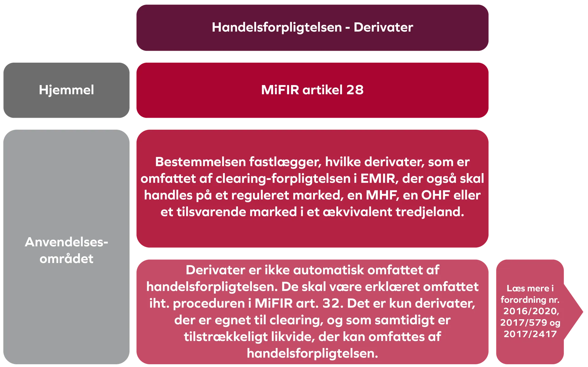 Anvendelsen af handelsforpligtelsen er defineret i artikel 32 i MiFIR. Artiklen beskriver den proces, som afgør, hvilke derivater der er omfattet af handelsforpligtelsen.