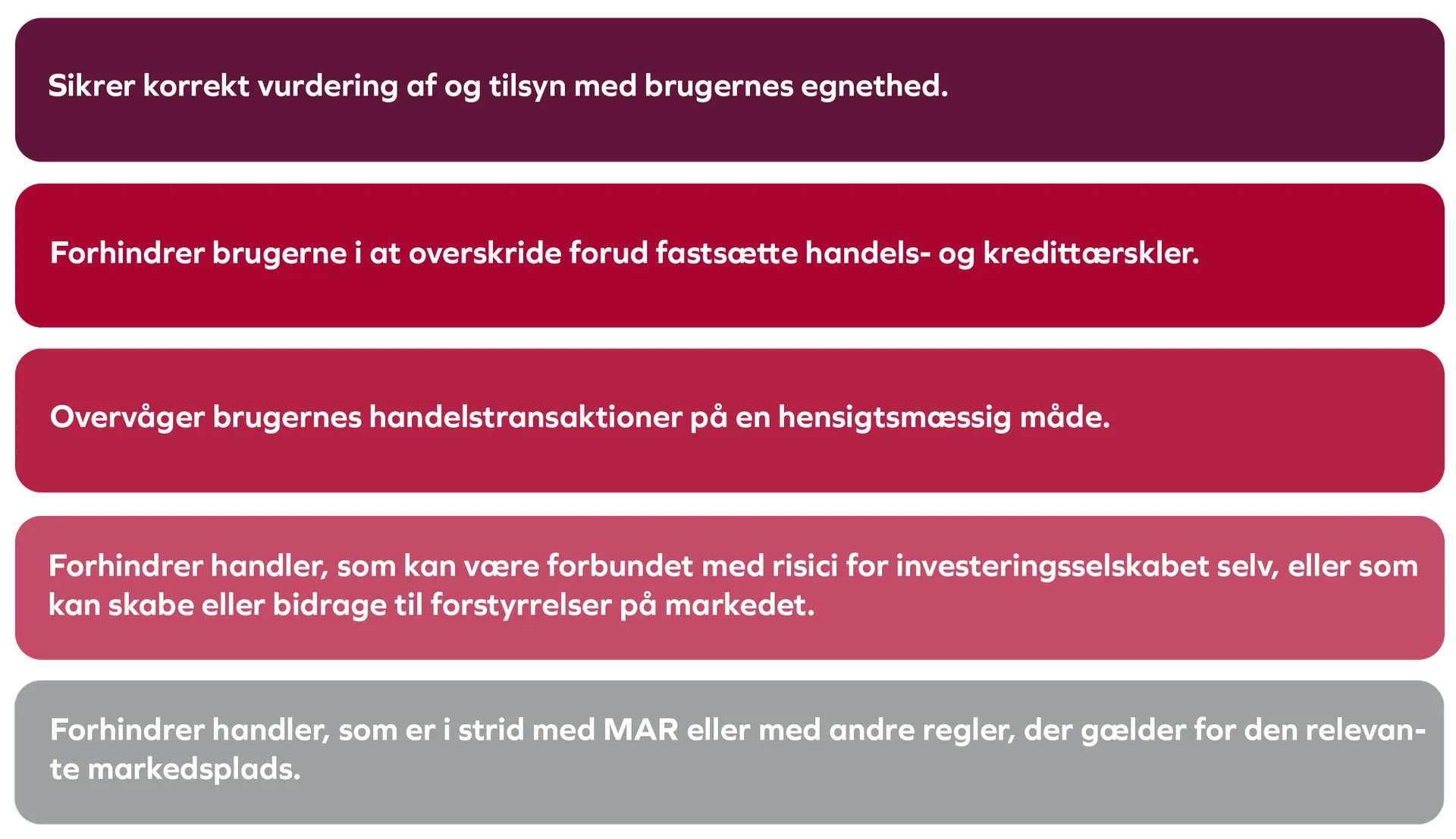 Kravene til et investeringsselskab er nærmere specificeret i kapitel 3 i Forordning 2017/589 om præcisering af de organisatoriske krav til investeringsselskaber, der benytter algoritmisk handel.