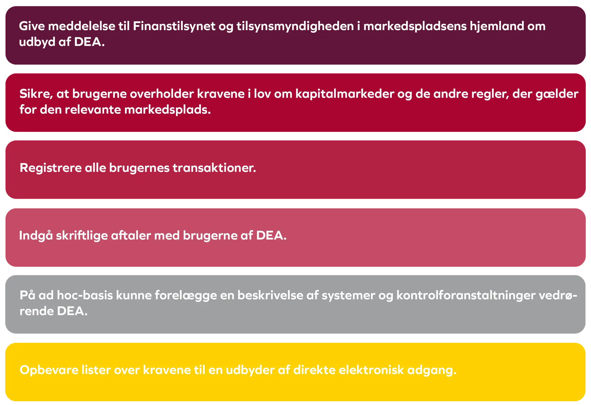I henhold til kapitalmarkedsloven er medlemmer af markedspladser, der udbyder direkte elektronisk adgang til deres kunder, underlagt regulering og krav.