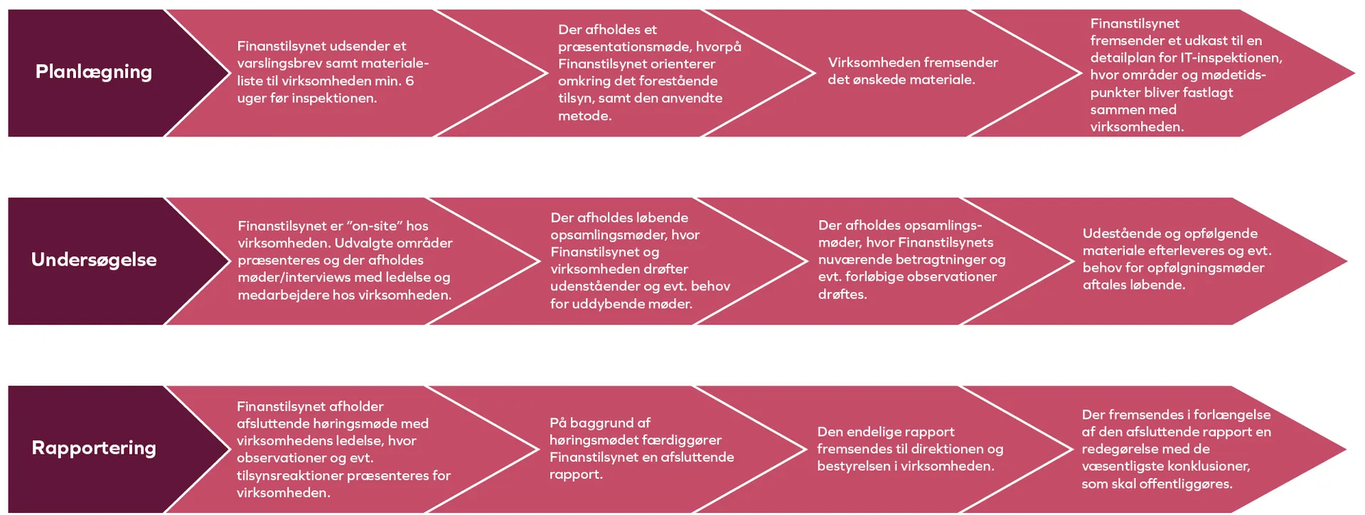 Nedenstående figur illustrer den ofte anvendte proces i forbindelse med Finanstilsynet IKT-undersøgelser. Såfremt det vurderes hensigtsmæssigt, kan der med virksomheden aftales mindre justeringen i fremgangsmåden. Finanstilsynet lægger vægt på at skabe dialog med virksomheden tidligt i processen for derved at få drøftet spørgsmål og uklarheder, således at IKT-undersøgelsen kan gennemføres med tilfredshed for begge parter, baseret på en klar og gennemsigtig proces.