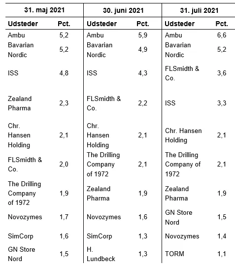 Ved udgangen af juli der samlet set betydelige korte nettopositioner (dvs. 0,2 pct. eller derover af den udstedte aktiekapital) i Ambu svarende til 6,6 pct. af selskabets udstedte aktiekapital, se tabellen nedenfor. Det er en stigning på 0,7 procentpoint i forhold til måneden før. Bavarian Nordic var den næstmest shortede aktie med korte nettopositioner svarende til 5,2 pct. af selskabets udstedte aktiekapital, hvilket er en stigning på 0,3 procentpoint i forhold til juni.