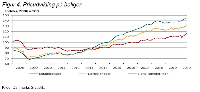 Boligmarkedet har samlet set ikke været negativt påvirket af COVID-19-krisen. Boligpriserne var ved udgangen af 4. kvartal 2020 højere end primo året, jf. figur 4, og handelsaktiviteten er høj for året som helhed på trods af et kraftigt fald i marts og april 2020. Kreditinstitutternes udlån til boligejerne er steget moderat, og der er ikke tegn på, at kreditstandarderne er lempet i 2020. Boligejerne afdrager og vælger ofte lang rentebinding, og omfanget af nye realkreditlån med høj gældsfaktor og belåningsgrad ligger relativt stabilt.