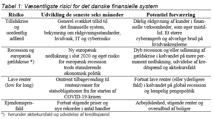 Fortsat lave renter og lave risikopræmier er hovedscenariet. Det vil lægge et yderligere pres på indtjeningen i de finansielle virksomheder. I Tabel 1 nedenfor er angivet i ikke prioriteret rækkefølge de væsentligste risici for det danske finansielle system.