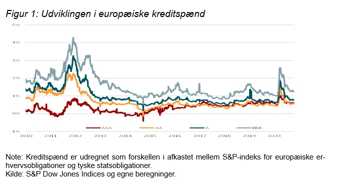 De europæiske kreditspænd blev udvidet markant ved indgangen til COVID-19 krisen, men er siden indsnævret igen, jf. figur 1.
