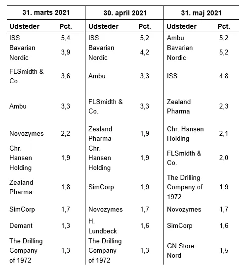 Ved udgangen af maj var der samlet set betydelige korte nettopositioner (dvs. 0,2 pct. eller derover af den udstedte aktiekapital) i Ambu svarende til 5,2 pct. af selskabets udstedte aktiekapital, se tabellen nedenfor. Det er en stigning på 1,9 procentpoint i forhold til måneden før. Bavarian Nordic havde tilsvarende korte nettopositioner svarende til 5,2 pct. af selskabets udstedte aktiekapital, hvilket er en stigning på 1,0 procentpoint i forhold til april.