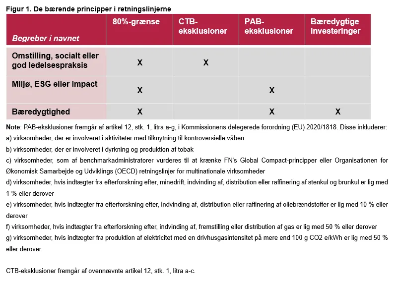 I lyset af de nye retningslinjer for navngivning af fonde, vil det være Finanstilsynets forventning, at der i de prækontraktuelle dokumenter for fonden (typisk prospektet og prospektbilaget) oplyses klart og tydeligt om de forhold, som understøtter navnet, når navnet er ESG- eller bæredygtighedsrelateret. Det vil sige, at det bl.a. skal fremgå, hvordan fonden opfylder kriterierne for det pågældende navn, herunder anvendelsen af eksklusionskriterierne for CTB eller PAB.