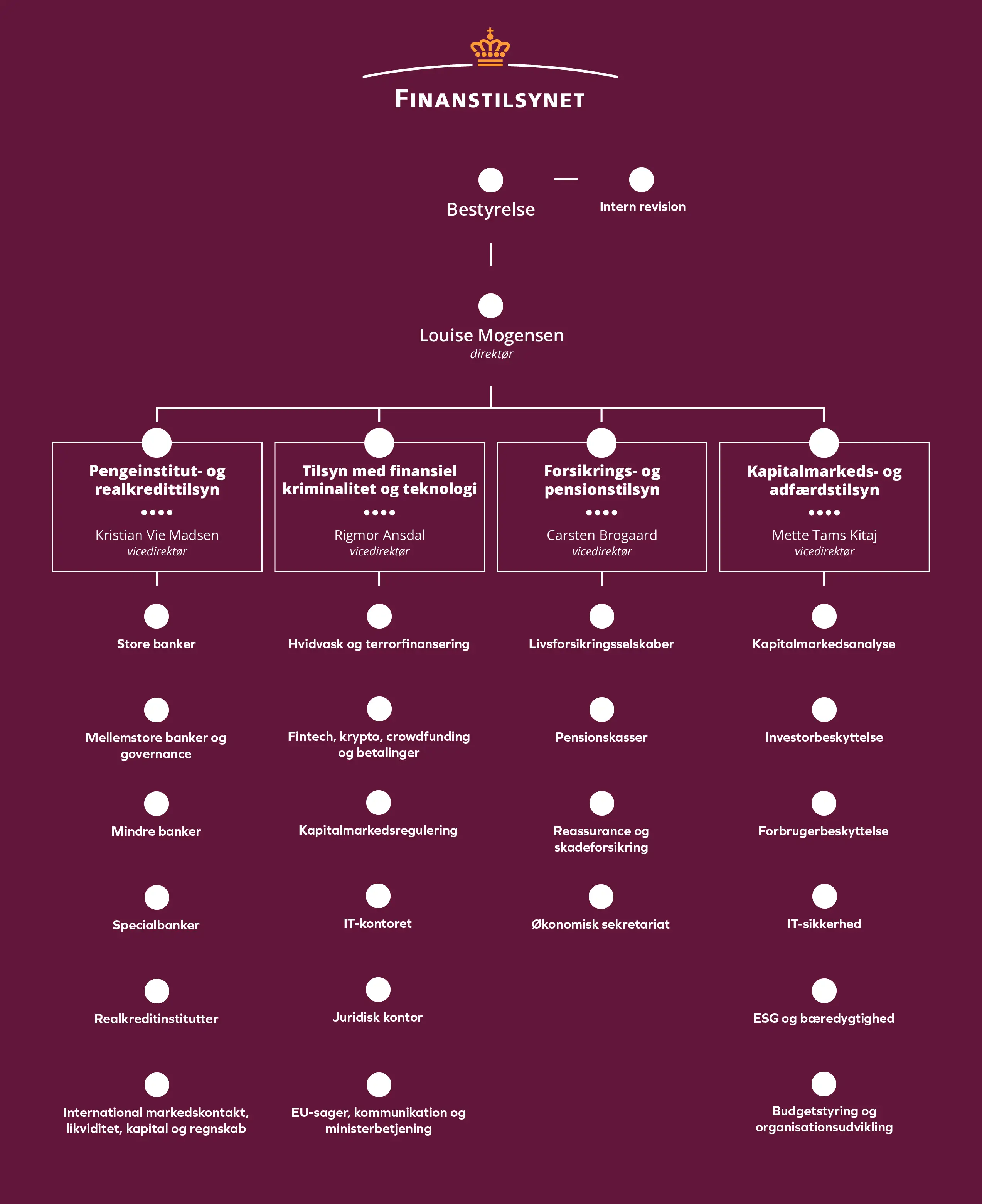 Vi fører ikke tilsyn med virksomheder, som de fleste andre kontorer i Finanstilsynet, men vi samarbejder med vores søsterkontor om tilsynet med Nasdaq, og med bankkontorerne om tilsyn med værdipapirhandlere.