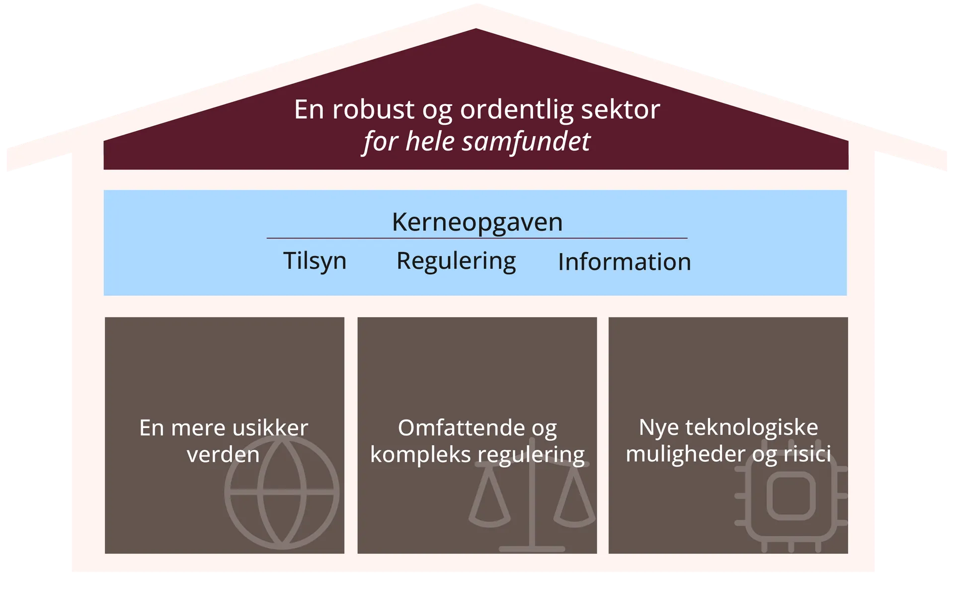 Kerneopgaven er: tilsyn med de finansielle virksomheder, udarbejdelse af ny regulering og information til vores omverden.